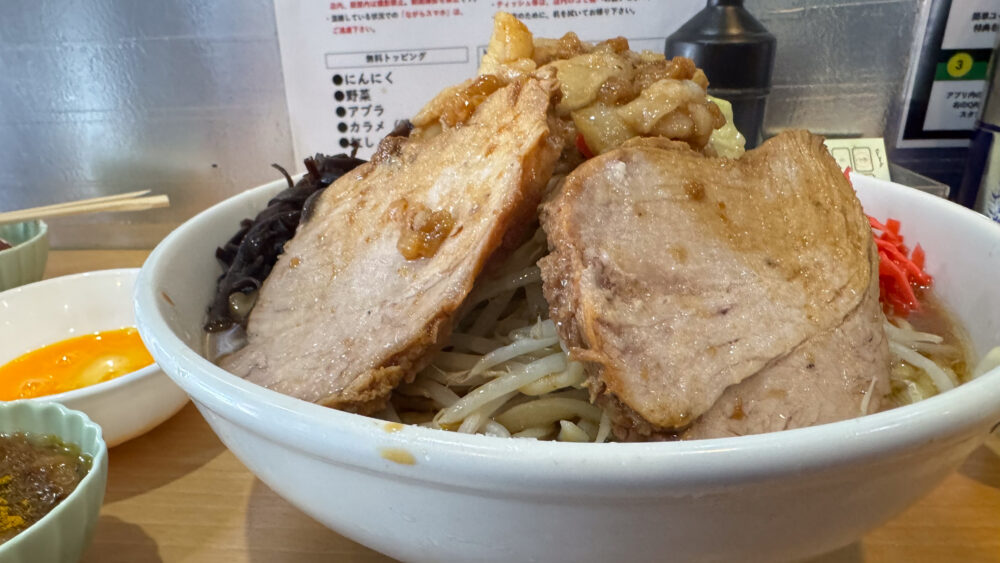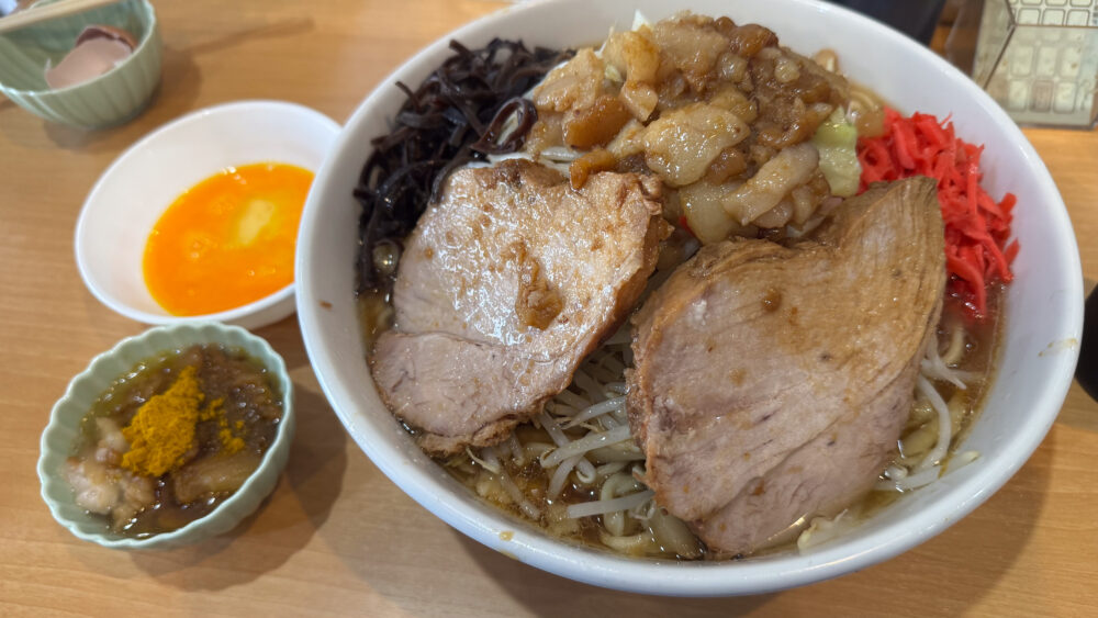 「大ラーメン(野菜アブラカラメ紅しょうがきくらげ)+生卵+カレー脂」を実食!