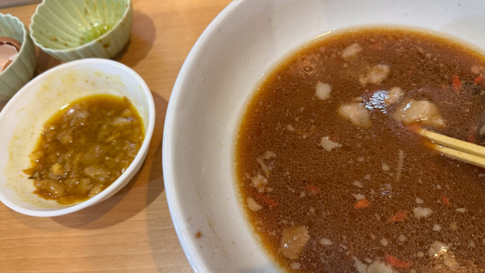 ▲カレー脂に残った生卵を投入し、麺をディップ。マイルドさとジャンクさが良いバランスで旨い。