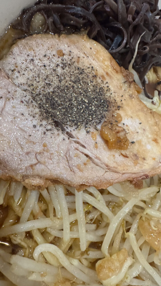 ▲残り1枚は、卓上の胡椒で胡椒豚に。胡椒を噛み砕きながら食べる豚が旨い。