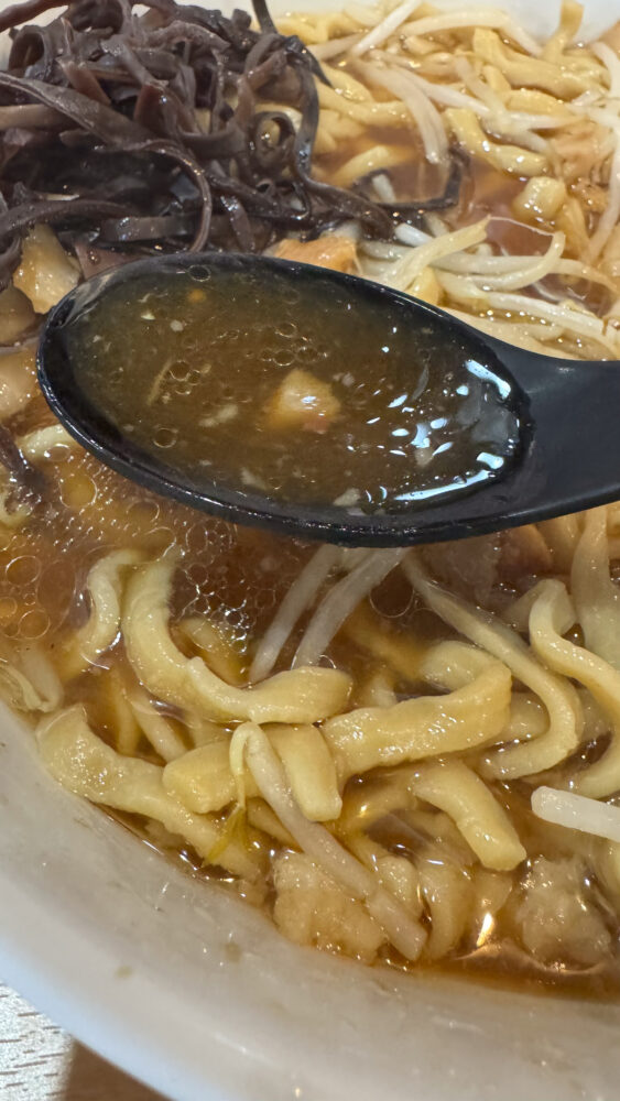 ▲スープは、非乳化ですっきり醤油テイスト。カラメコールしましたが、グビグビ飲めてしまうほど。