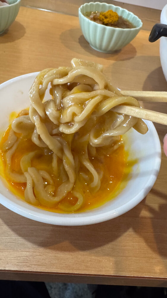 ▲生卵に麺をディップして味変するのも良き。一気にマイルドでやさしい味わい。