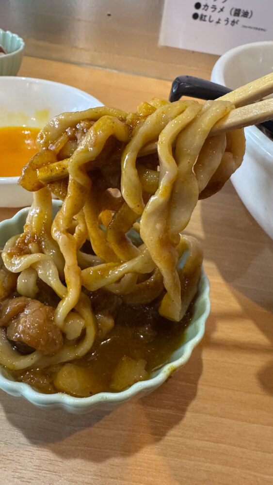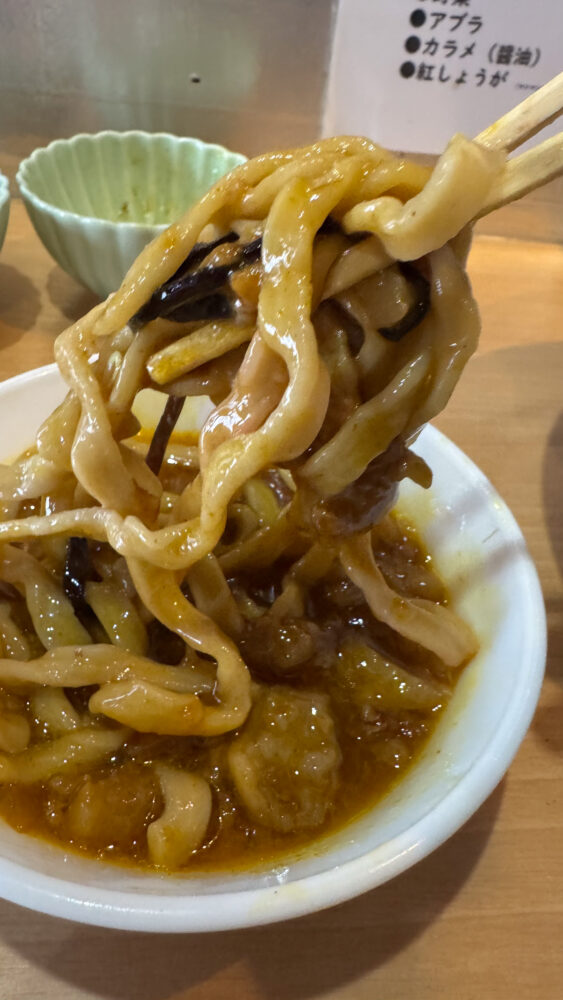 ▲カレー脂にも麺をディップして味変。濃いめのカレーでジャンクさがたまりません。