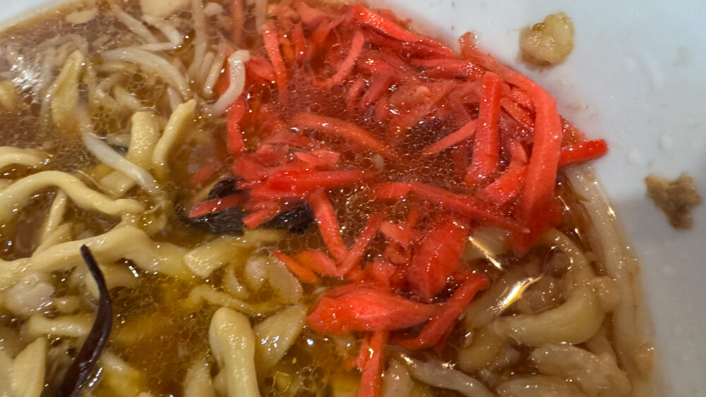 ▲終盤は温存していた紅しょうがで味変。これが優秀で、終盤の重たさが、紅しょうがの清涼感で一掃されます。