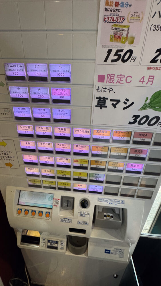 にんにくは通常入っておらず、マシマシは食券購入が必要です。