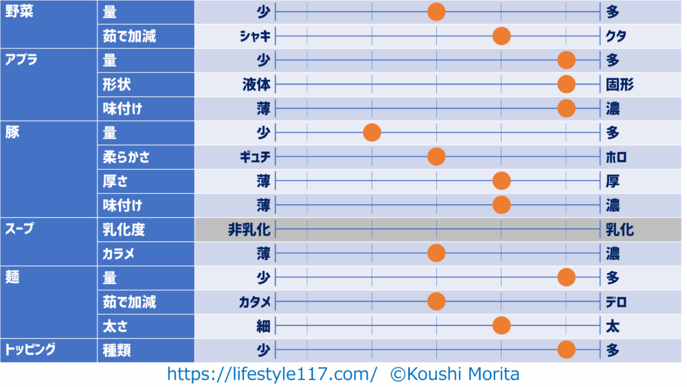 アブラ麺はスープがないため、スープの乳化度はグレーアウトしています。