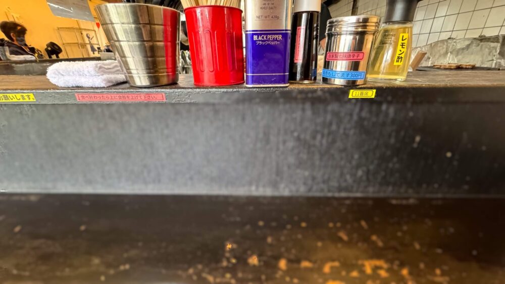 ▲卓上調味料はブラックペッパーやカエシ(二郎系専用タレ)、自家製七味唐辛子、レモン酢。
