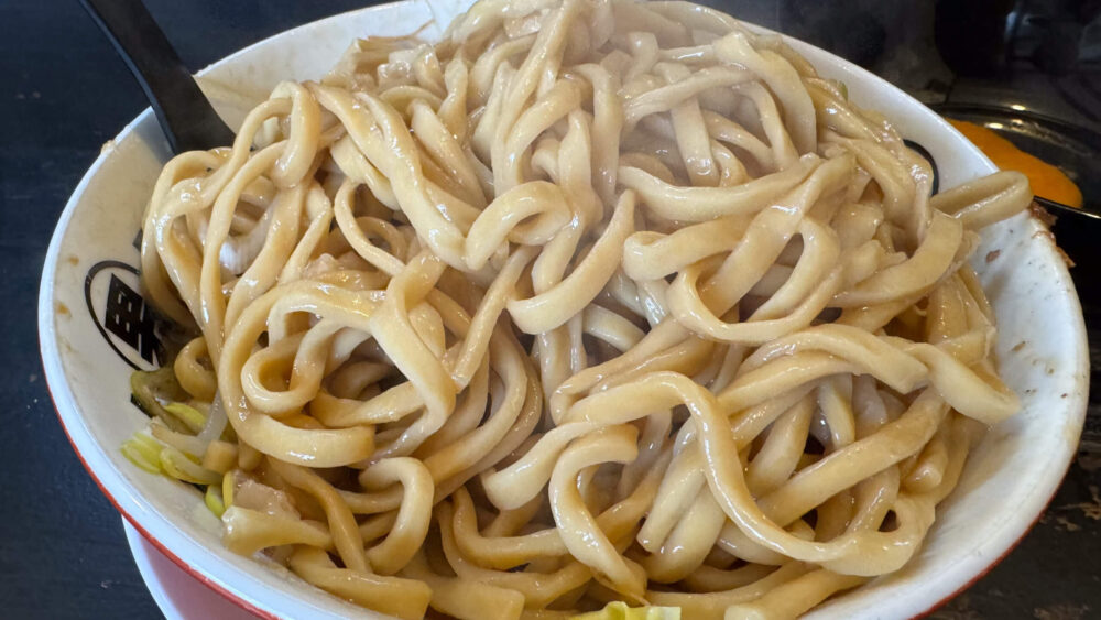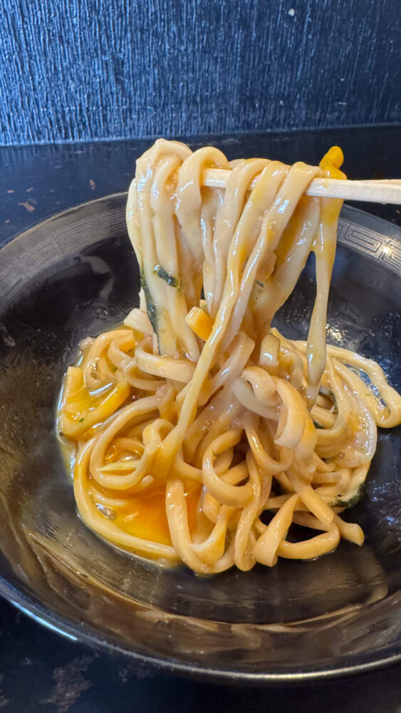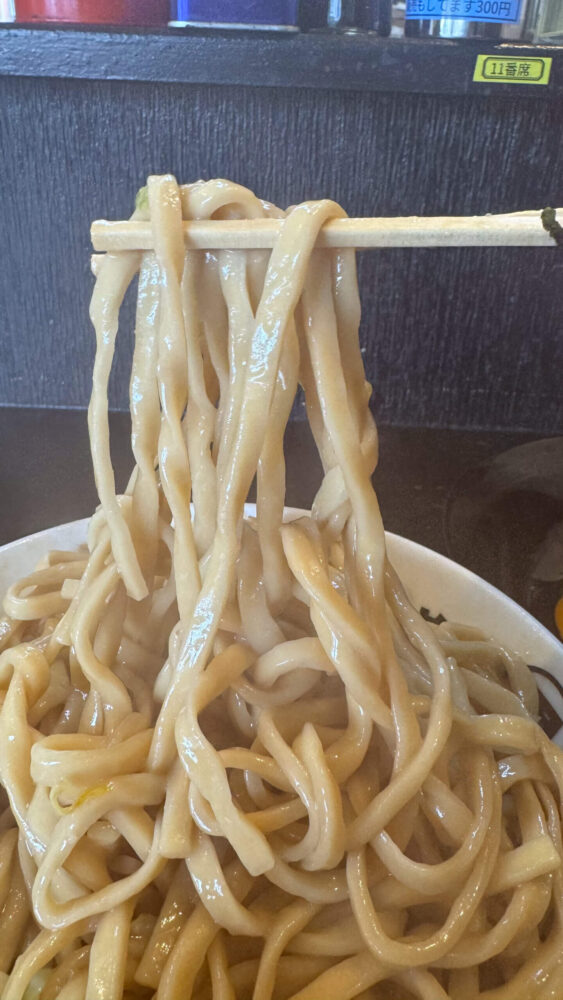 ▲やや平打ちっぽい麺はゴワワシ食感で食べ応え抜群。タレと脂が絡んでめちゃ旨。