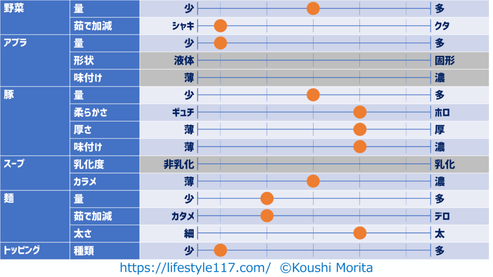 私は原則ニンニクを入れない(妻に怒られるので)ため、項目からニンニクは除外しています(今回はニンニクありでしたが)。