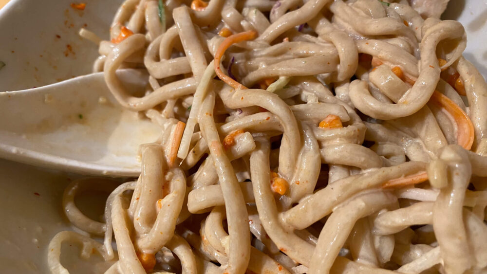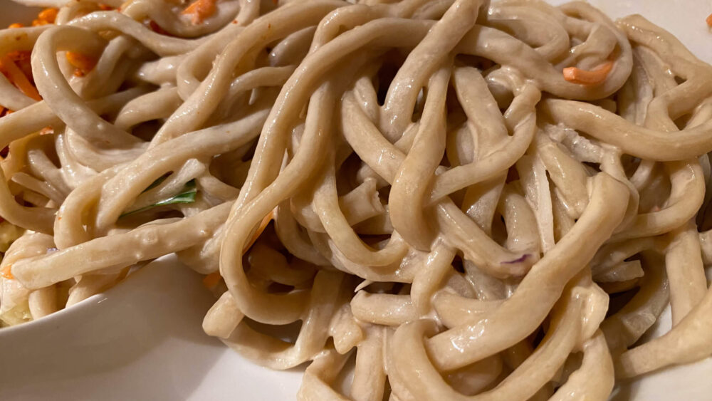 ▲野菜を食べ終えたら、しっかりと麺を混ぜ合わせます。