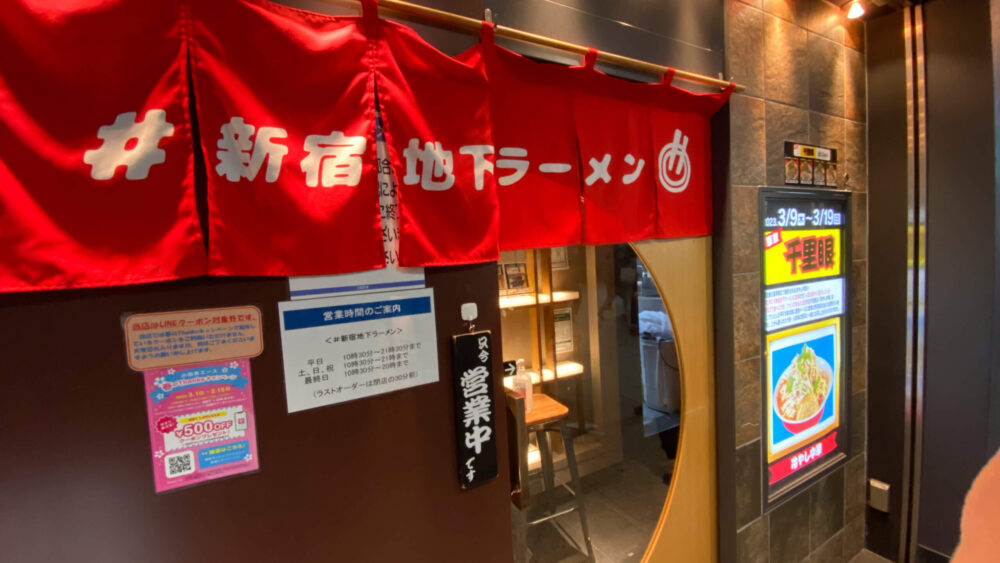 ▲真っ赤な「#新宿地下ラーメン」の暖簾。お店は期間によって変わるシステム。