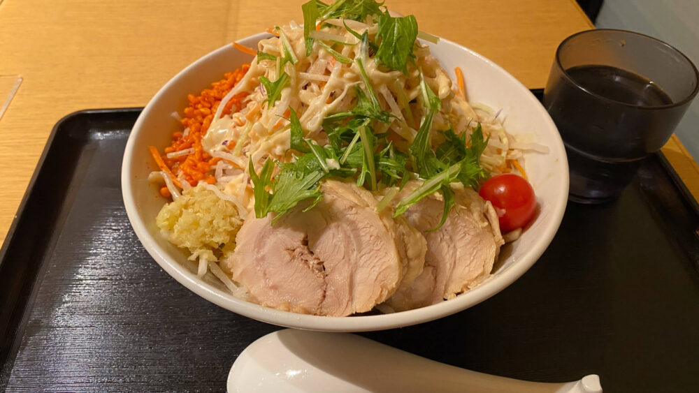 水菜や大根、人参、プチトマトも含めたサラダが清涼感のある二郎系の冷やし中華です!