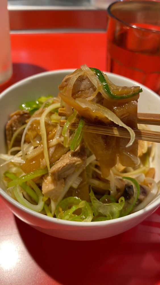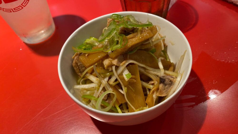 ▲味もお酒に合うようにしっかりめ。ネギ・メンマ・チャーシューと異なる食感も面白くて良いアテ。