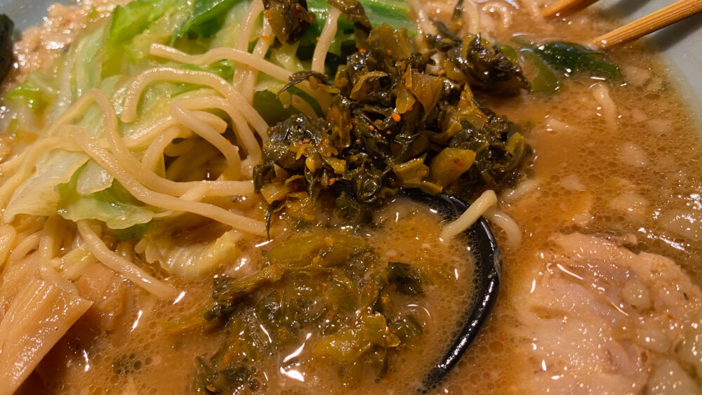 ▲今回の味変は高菜。味噌スープがより濃厚になって食欲増進です。
