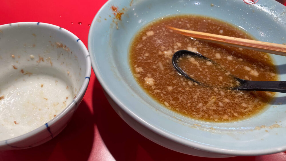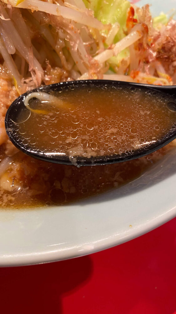 ▲スープは微乳化気味。上品で旨味のある感じですが、ほんのりニンニクの風味あり。