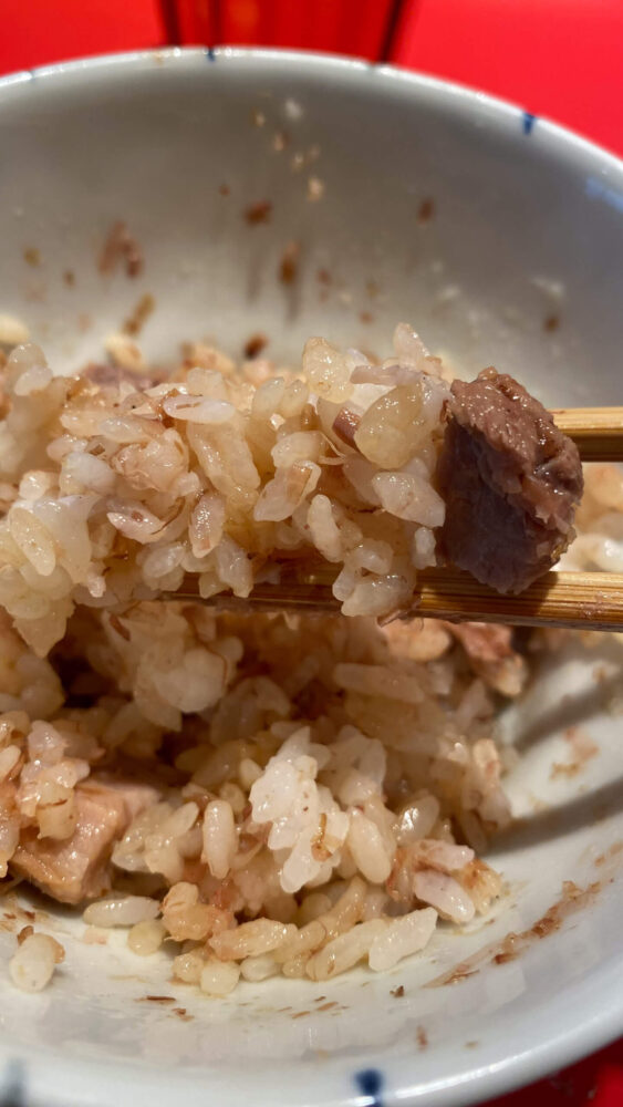 ▲バターとかつお節、角切りチャーシューをご飯とよく混ぜ合わせていきます。