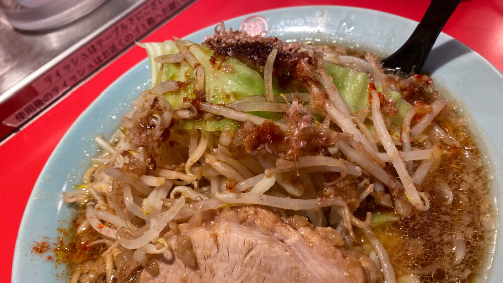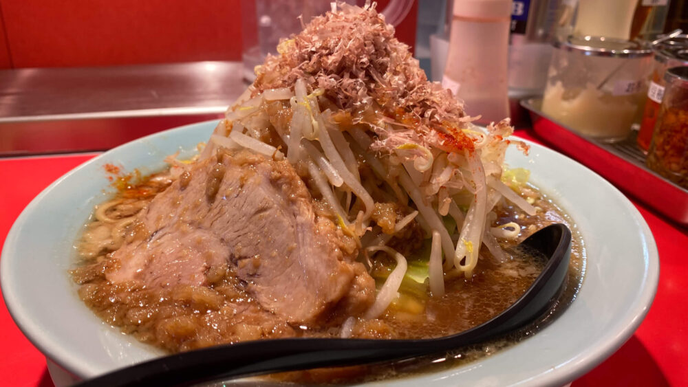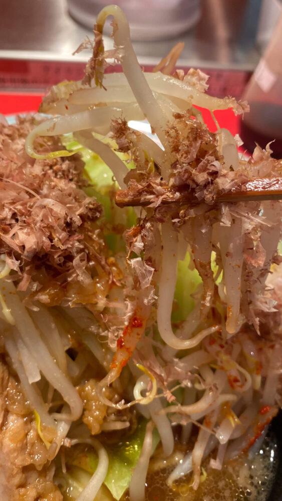 真打登場の猫次郎(にゃじろう)!完全に二郎系な一杯ですが、頂上のかつお節が特徴的!