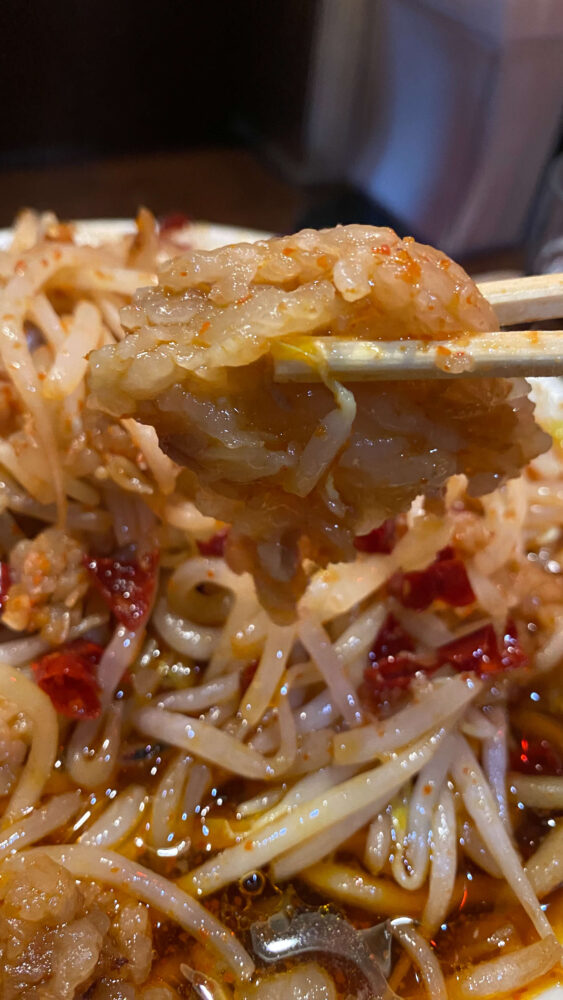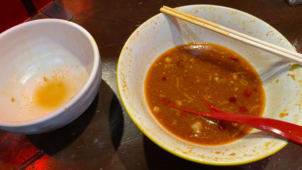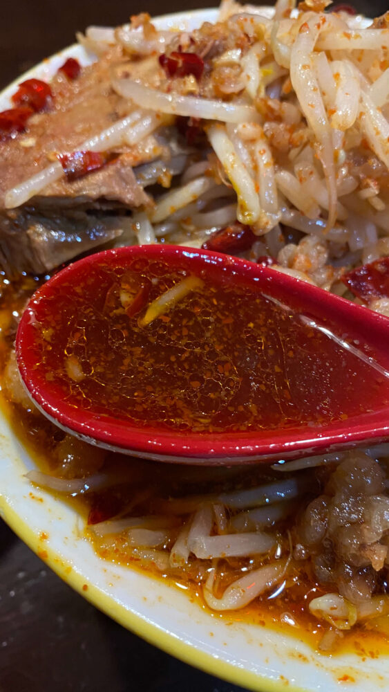 ▲非乳化スープ。ベースは醤油が立ったスープですが、唐辛子系の旨辛系。