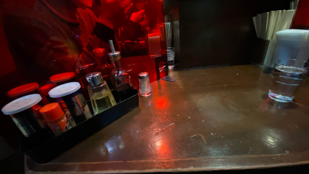 ▲卓上調味料はカエシ、胡椒、一味唐辛子、お酢など。