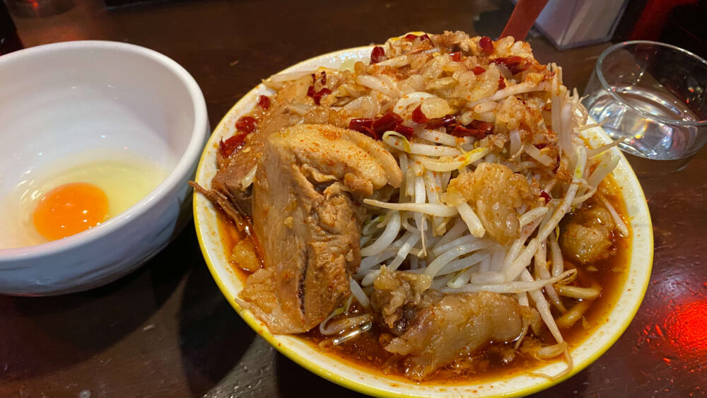 「辛いらーめん大ブタ2枚(やさい多め味あぶら多め)+生たまご」を実食!