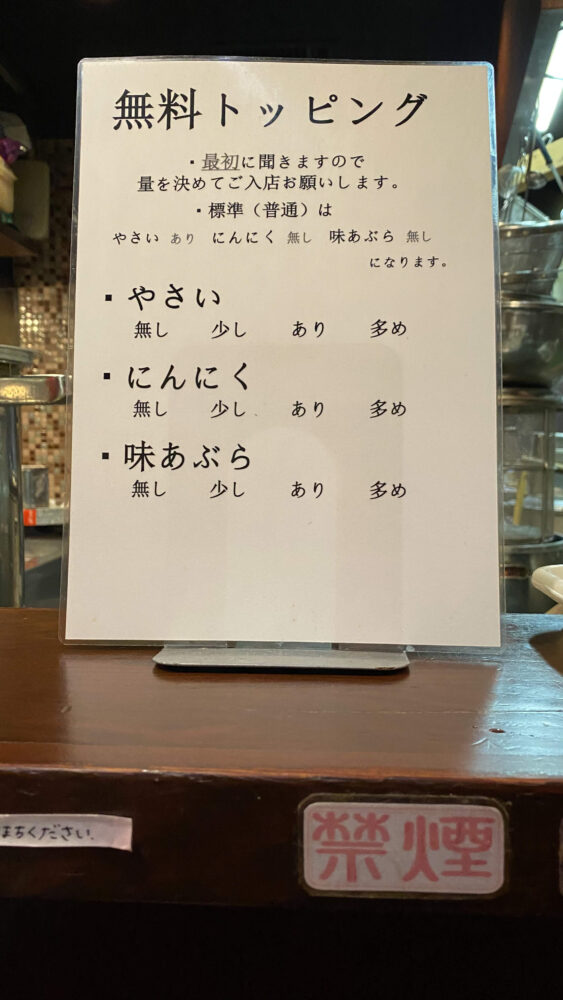 座席の目の前には無料トッピングの説明書きが立てかけられているため、ヒアリングされるまで内容を検討しておくと良いでしょう。