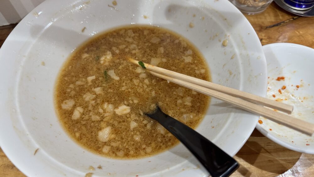 ▲スープは、ライトな非乳化ですっきりテイスト。ただし、背脂マシマシにしたので油分はかなり多め。