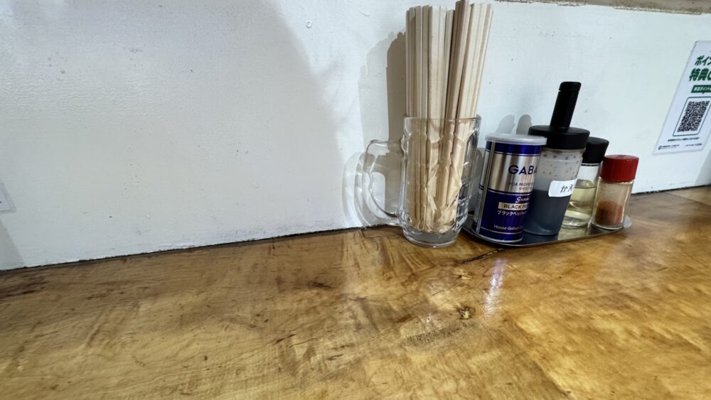 ▲卓上調味料はかえし・一味唐辛子・ブラックペッパー・お酢といった王道のラインナップ。