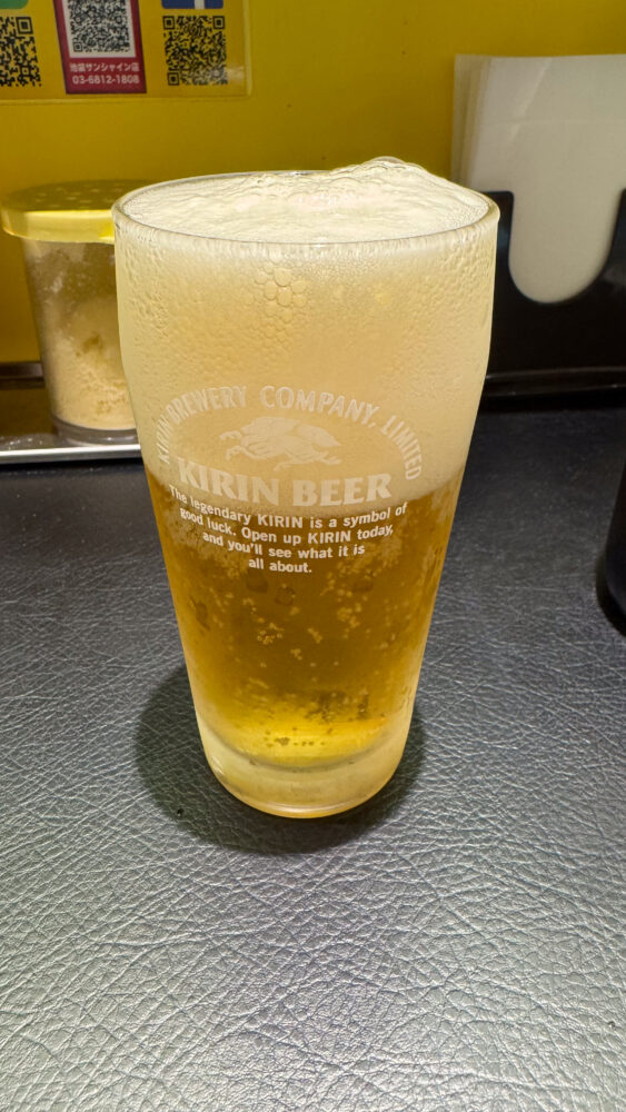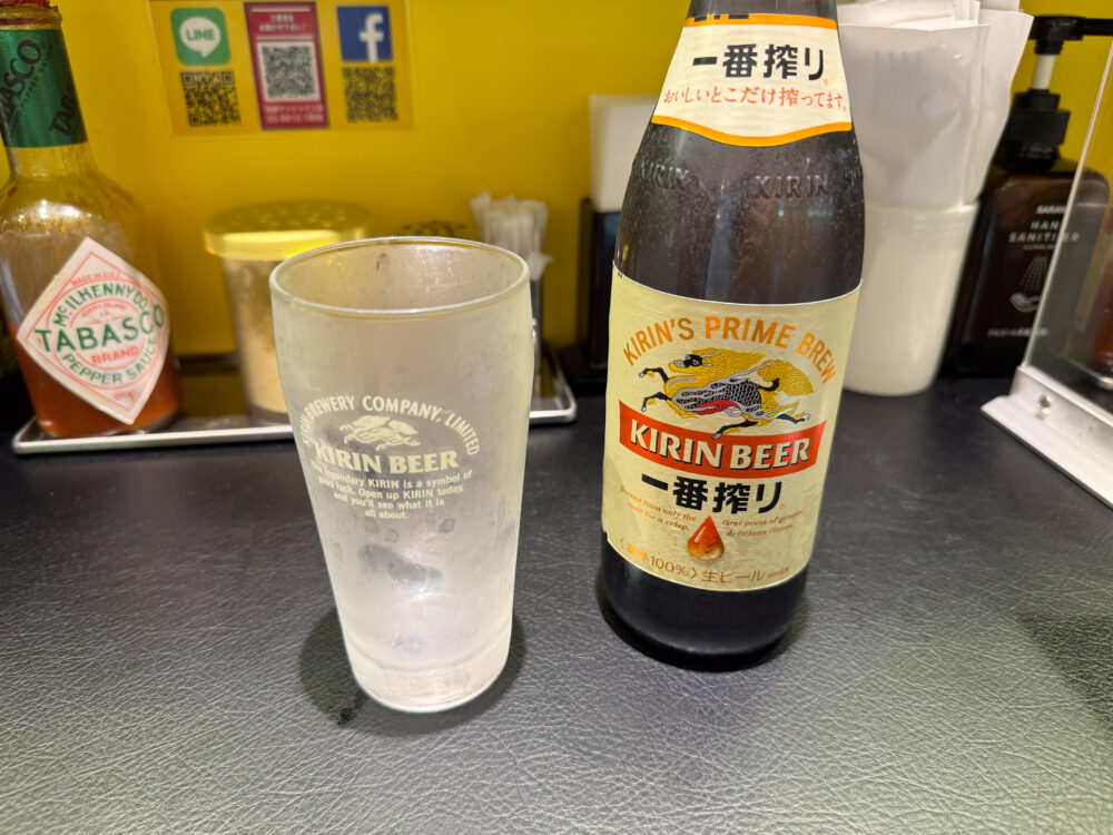 ▲最初に瓶ビール(キリン一番搾り)からの提供。グラスはしっかり冷えているのがありがたい。