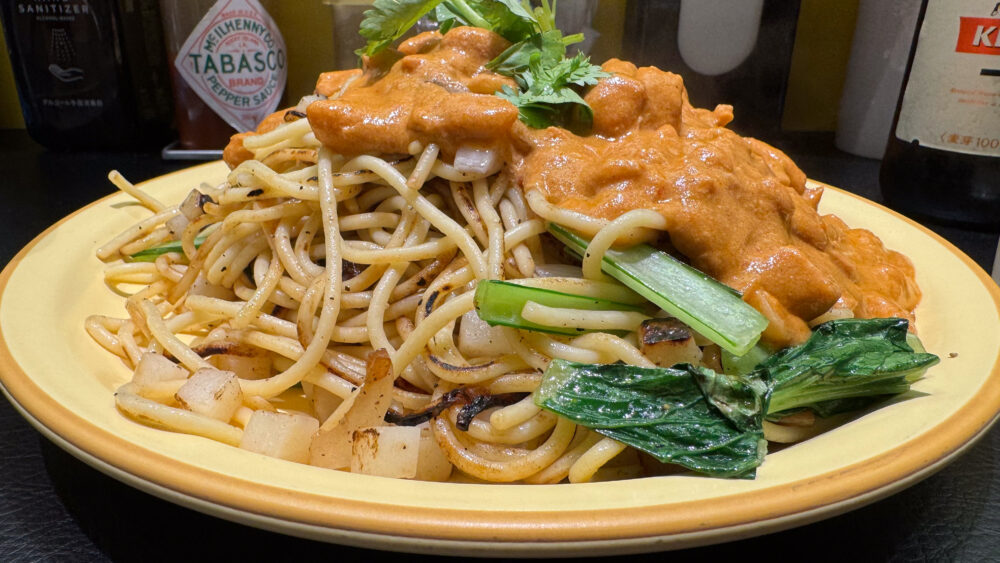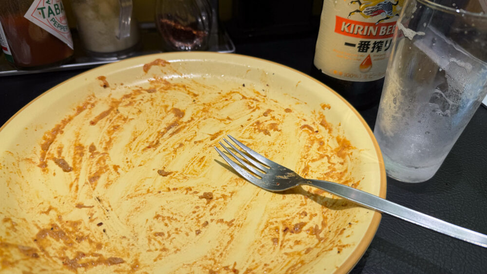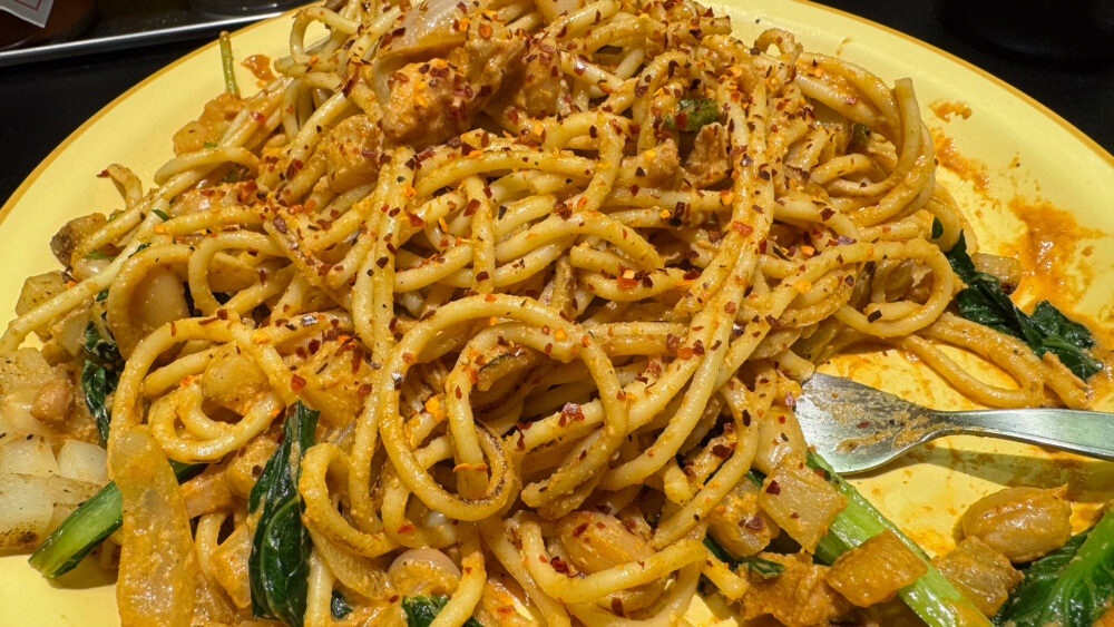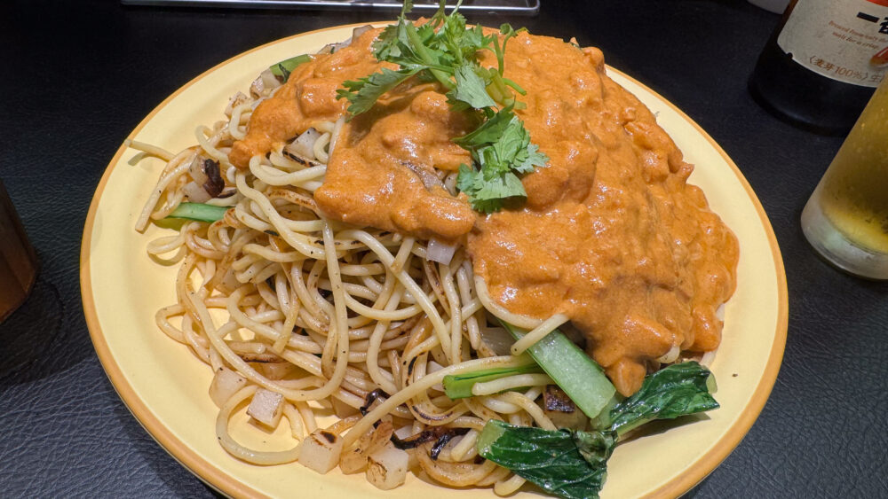 ▲横から見ると、しっかり炒められていたパスタがこんもり盛られていることが分かります。