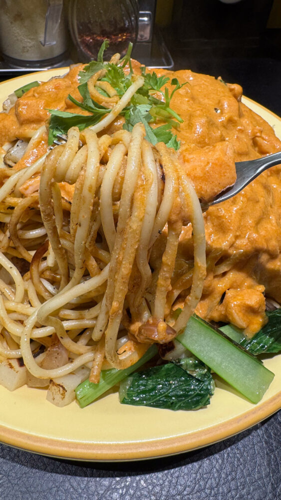 マッチョマンカレーは、バターチキンカレー的なカレーとしっかり炒められた太麺が絡んで美味しかったです!