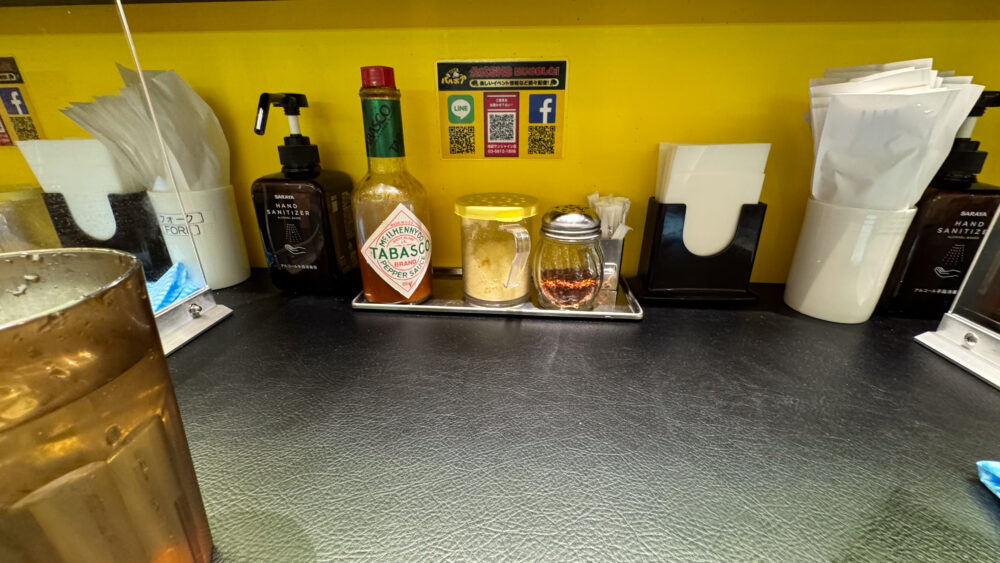▲卓上調味料はタバスコ、フレーク状の唐辛子、粉チーズ。フォークは各席に配備されているタイプですね。
