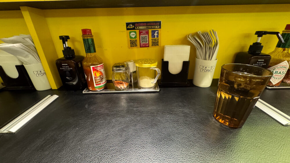 ▲卓上調味料はタバスコ、フレーク状の唐辛子。フォークは各席に配備されているタイプですね。