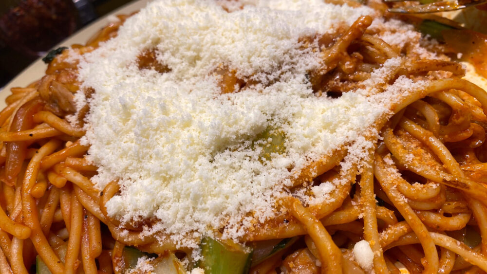 チェダーチーズがオンされた大皿のナポリタン!焼き目がついた太めの麺が食欲をそそります!
