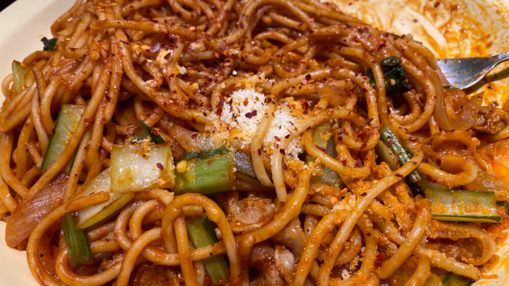 ▲パスタを食べると、炒められた麺が香ばしくて美味しいです。赤ワインにも合います。