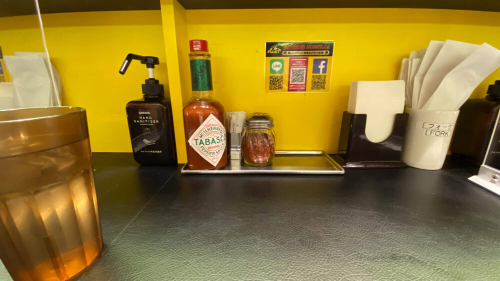 ▲卓上調味料はタバスコ、フレーク状の唐辛子。フォークは各席に配備されているタイプですね。