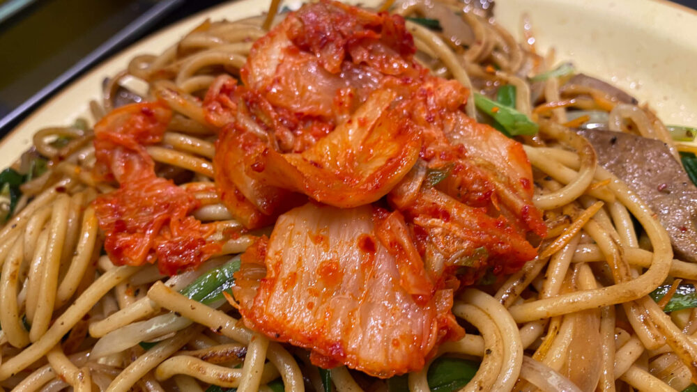 ▲有料トッピングのキムチで別方向にピリ辛へ味変。ザクザク食感と酸味で食欲が増しますね!