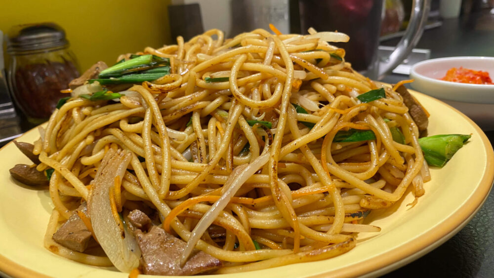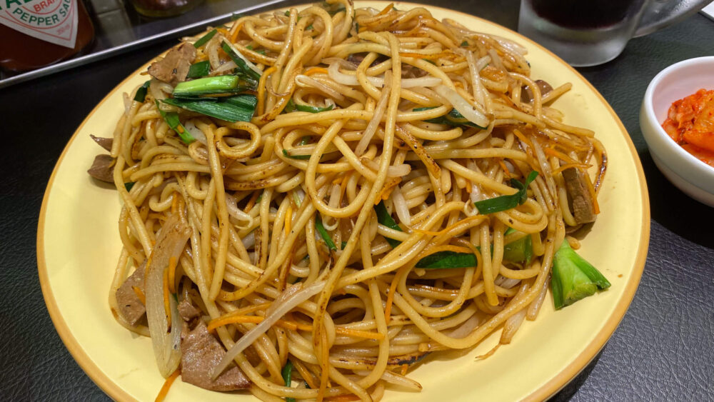 ▲横から見ると、焦げ目のついた太麺にレバニラ、もやし、タマネギ、人参が一体となっています。