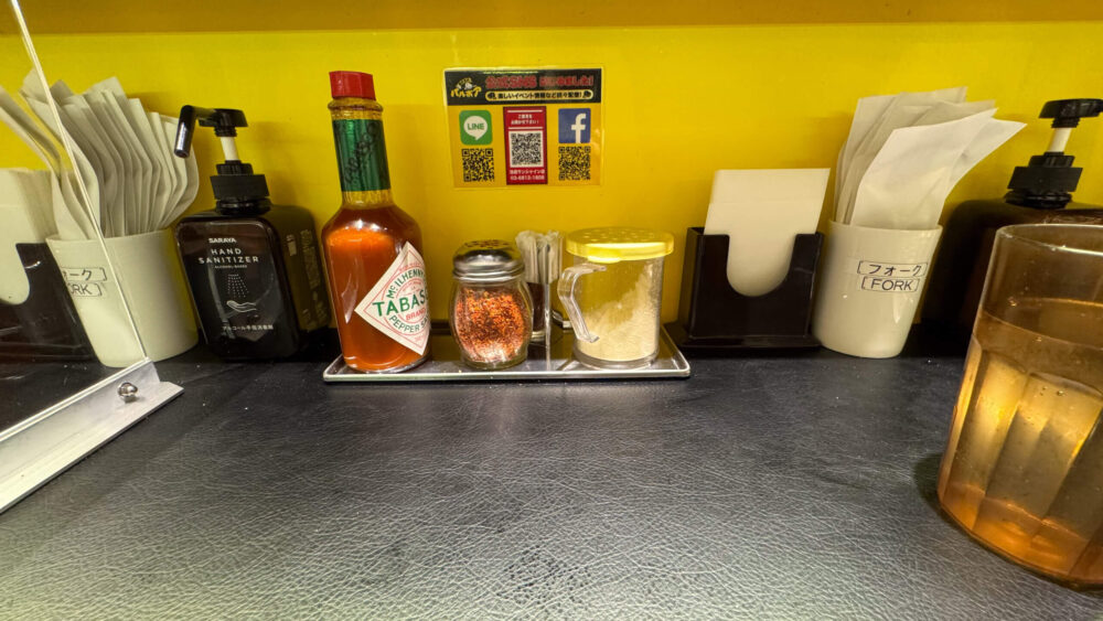 ▲卓上調味料はタバスコ、フレーク状の唐辛子。フォークは各席に配備されているタイプですね。
