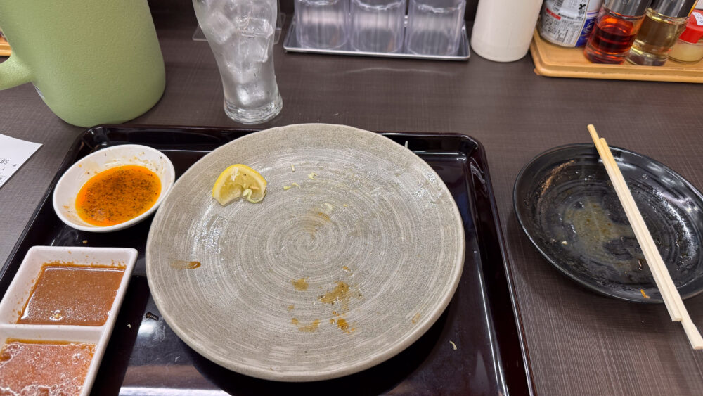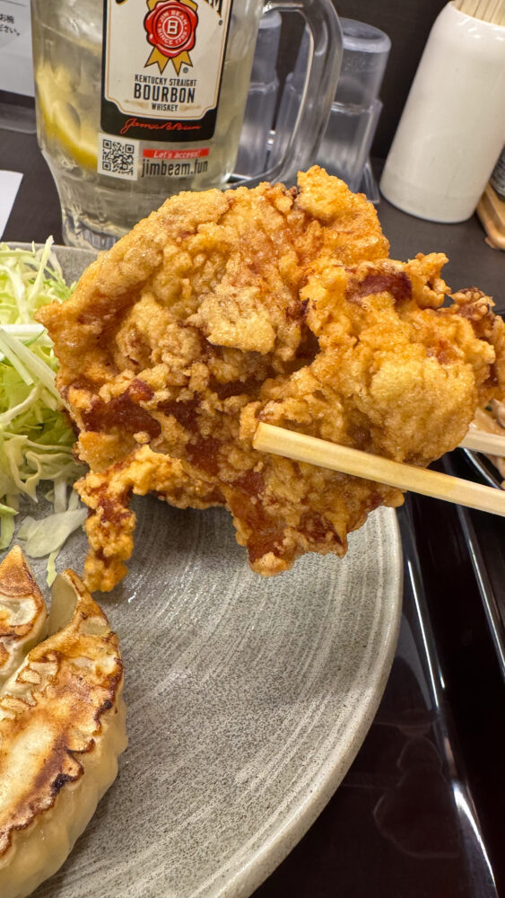 ▲まずは大ぶりなから揚げから。クリスピーな衣とジューシーなお肉が美味。付属のつけダレで味変も楽しめて良き。