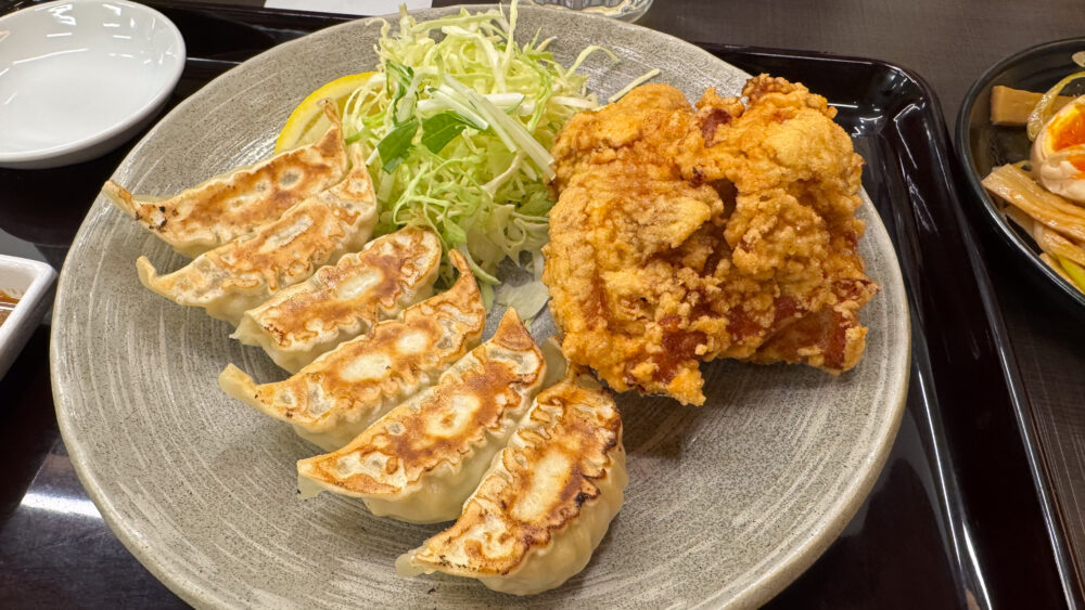▲ギョウカラも着皿。餃子6個とから揚げ2個の盛合せ。