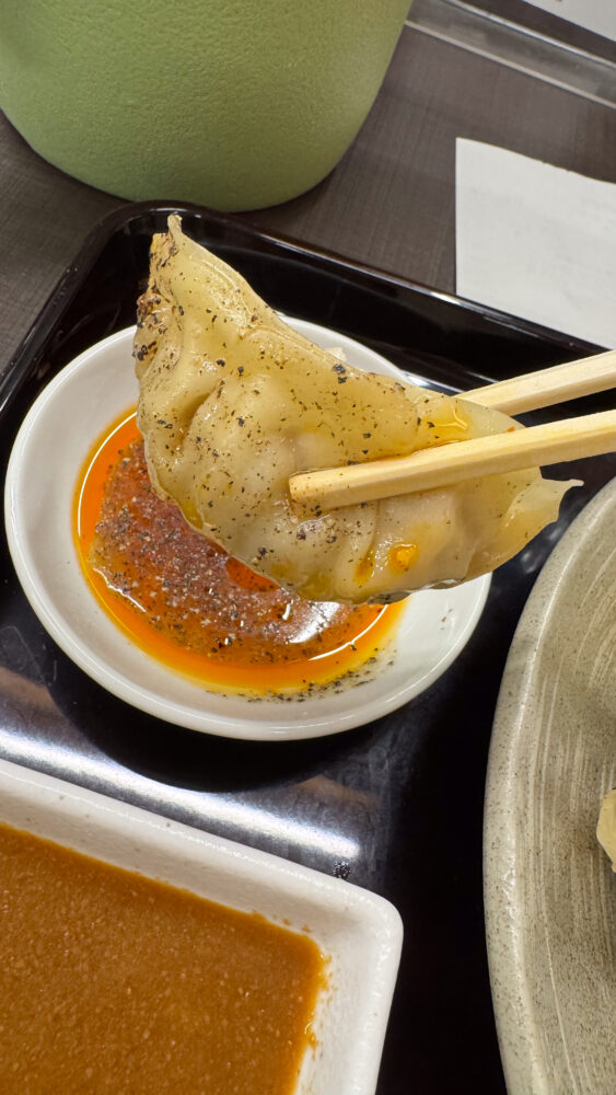 ▲餃子も楽しみます。醤油+ラー油+お酢+胡椒で食べるとパンチがあって旨し。皮もモチモチ。