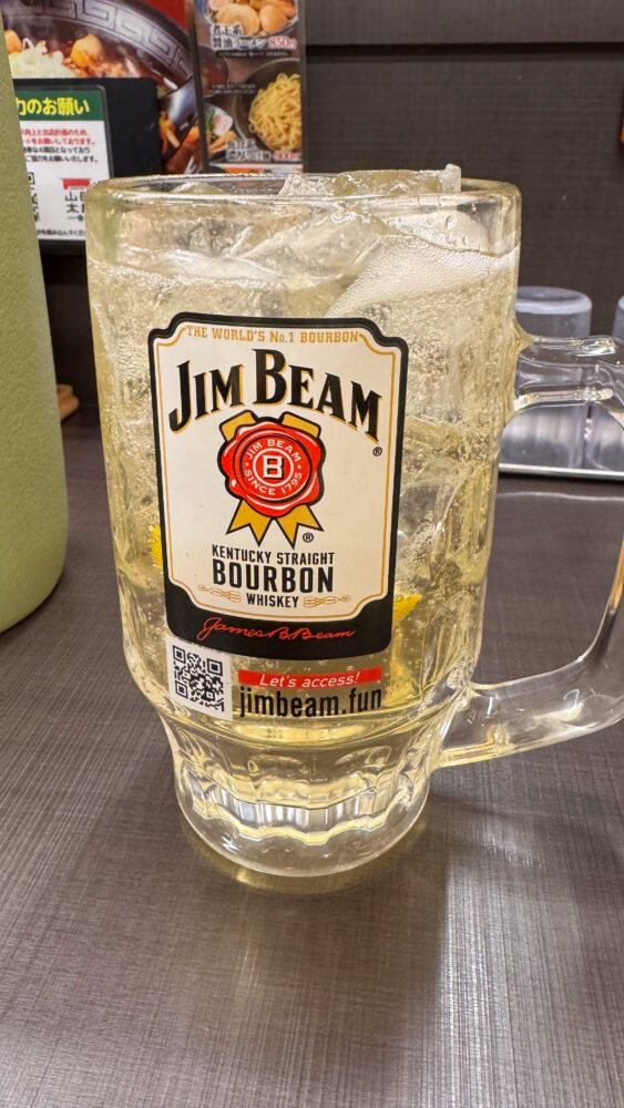 ▲1杯目はメガハイボール。ジムビームで飲みやすい。490円でメガはお得。