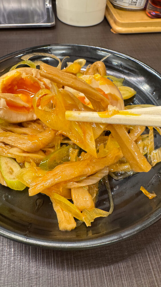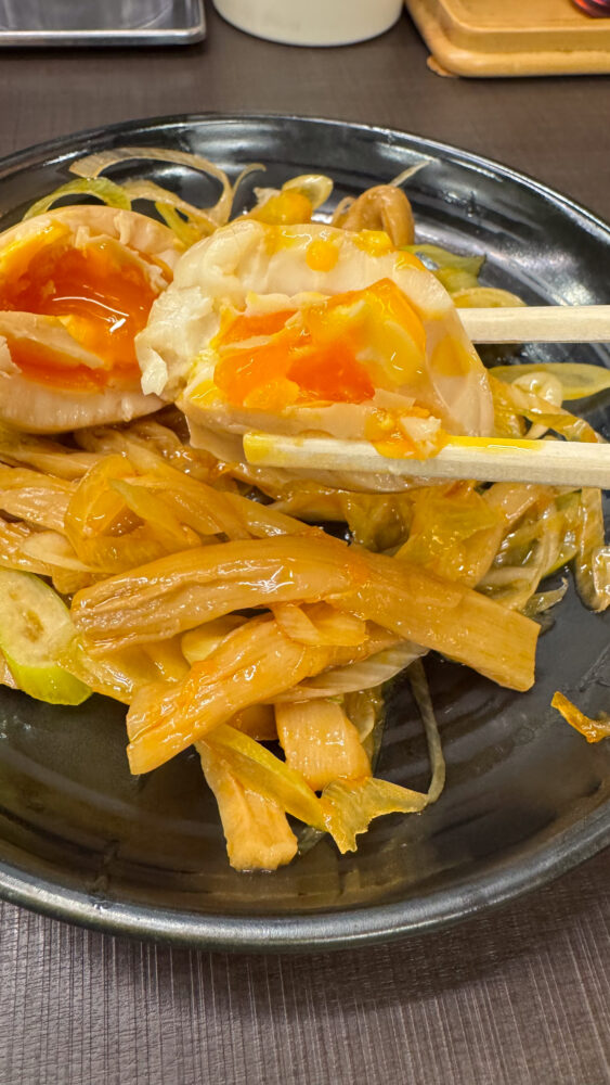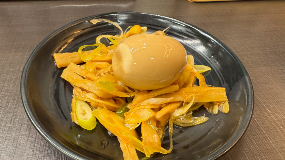 ▲まずはピリ辛ねぎメンマから着皿。半熟味玉が乗っていて美味しそう。