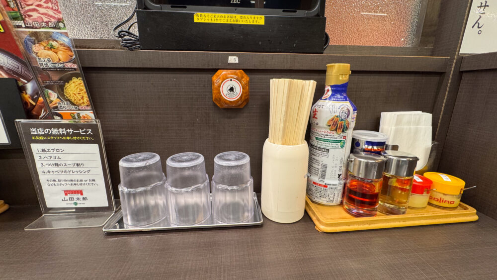 ▲卓上調味料は、しょうゆ、ラー油、お酢、胡椒、にんにく、しょうが。紙エプロンやヘアゴムなどの無料サービスも充実していますね。