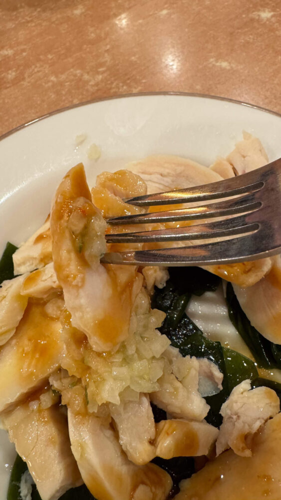 ▲蒸し鶏の香味ソース(税込280円)。最近のお気に入りメニュー。