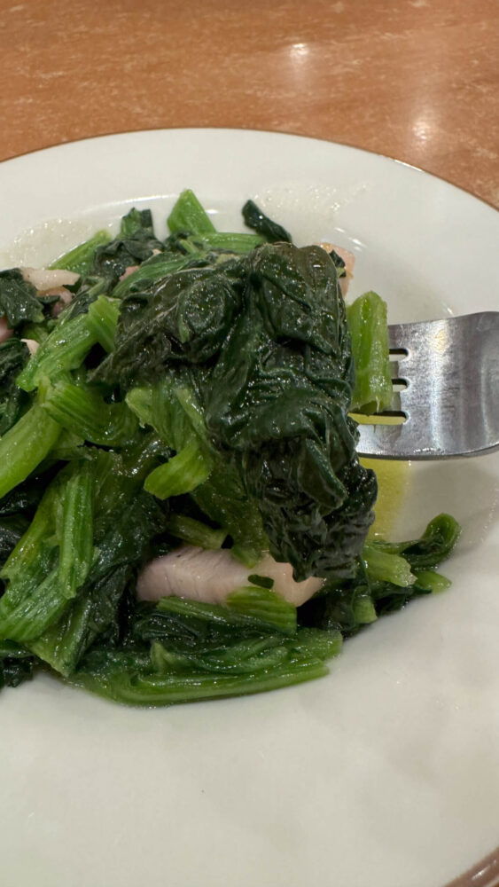 ▲ほうれん草のソテー(税込200円)。低価格なので、お腹の状況に合わせて調整弁になってくれるメニューですね。