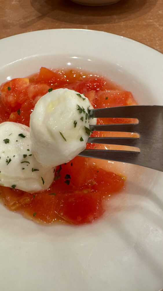 ▲なめらかなモッツァレラチーズとフレッシュなトマトが相性バッチリ。ワインに合います。