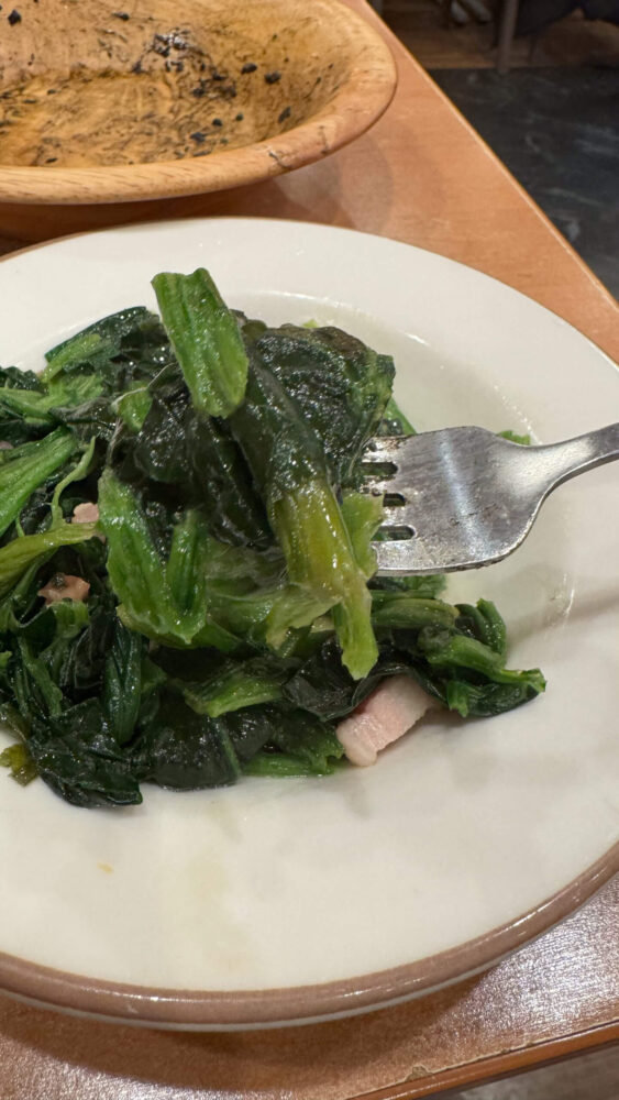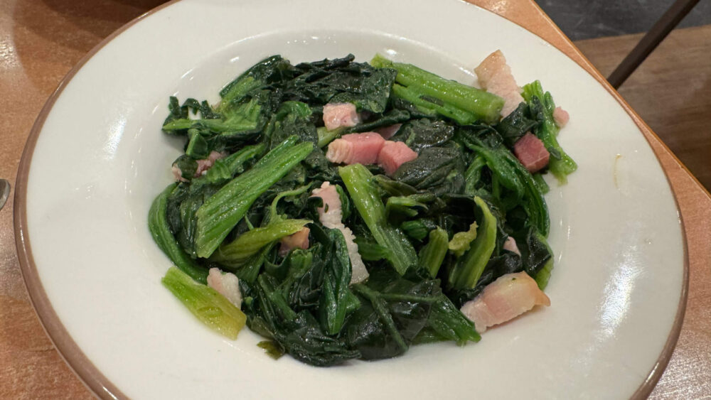 ▲ベーコンとオリーブオイルでほどよい塩味のほうれん草が美味。ほうれん草の量もけっこうあってお得。