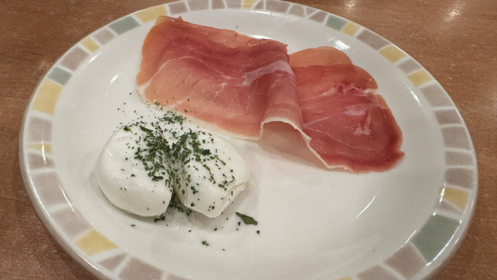 ▲生ハムとバッファローモッツァレラの盛合せ(税込500円)。1枚でハモン・セラーノとバッファローモッツァレラを両方楽しめるお得メニューですね。