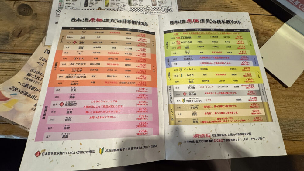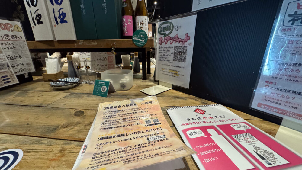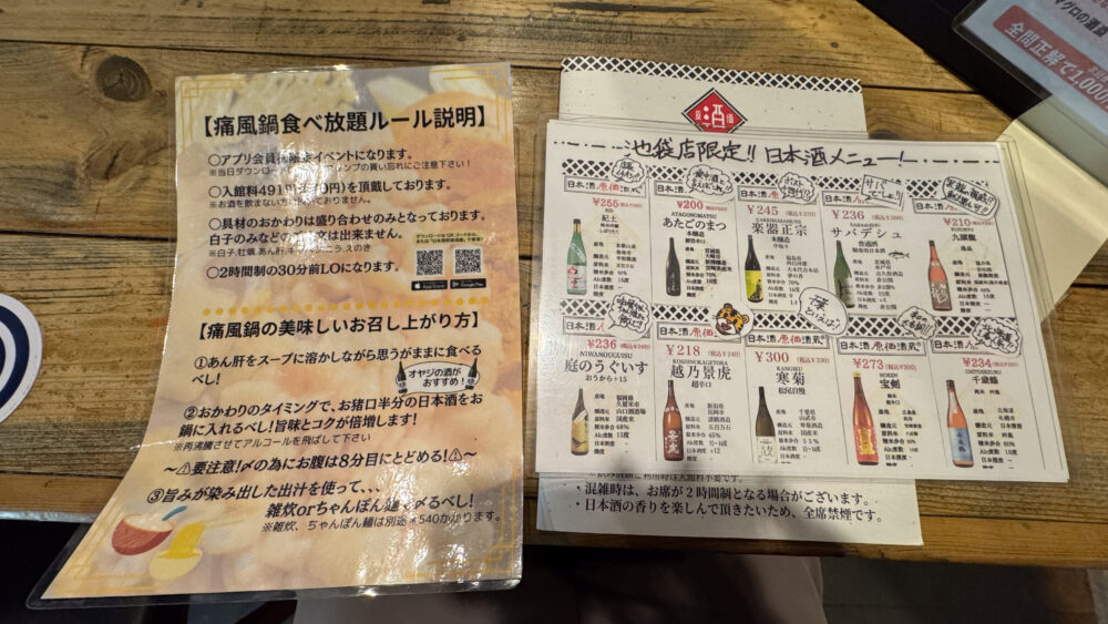 食べ放題のルールや、日本酒のメニューは席に配置されています。
