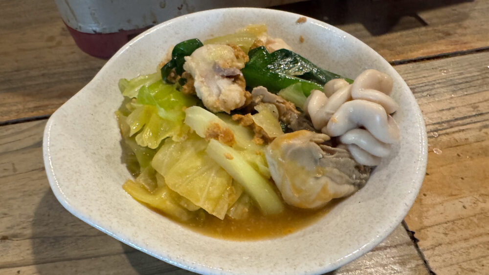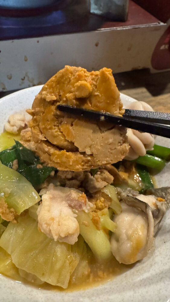 ▲キャベツが煮えて良い感じに煮立ってきました。あん肝や白子、牡蠣に火が通ったか見極めていきます。
